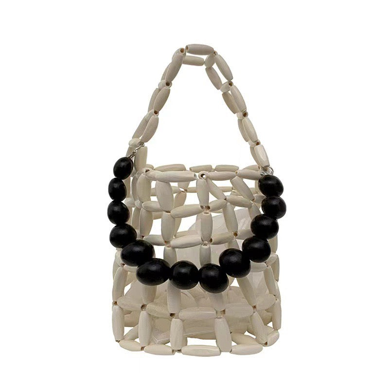 Fashionable beaded women's handbag, wooden bead bucket bag, hollow square women's bag